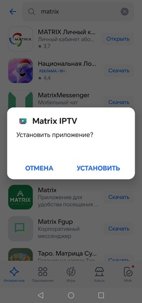 Откройте магазин приложений RuStore в Вашем мобильном устройстве. В поле для поиска напишите Matrix. Рядом с приложением Matrix IPTV нажмите кнопку Скачать.