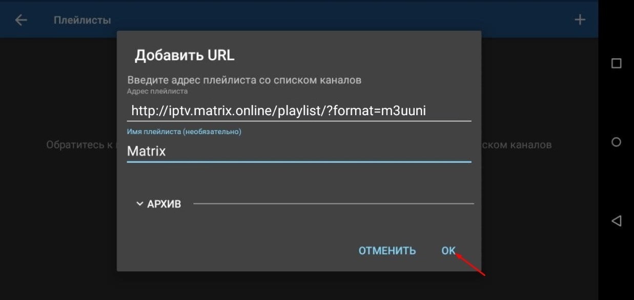 В поле Адрес плейлиста укажите http://iptv.matrix.online/playlist/?format=m3uuni , Имя плейлиста(необязательно) - Matrix и нажмите OK