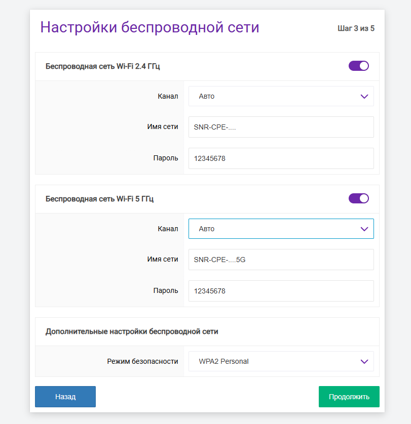 Роутер предложит настроить сеть wi-fi. «Канал» выставляем «Авто», чтобы при перезагрузки роутер сам выбирал подходящий для работы wi-fi сети. Указываем предпочитаемое «Имя сети и пароль» для каждого из диапазонов. Рекомендуется, если имена сетей одинаково заданы, для имени сети 5 ГГц в конце добавить «5G» для различия.