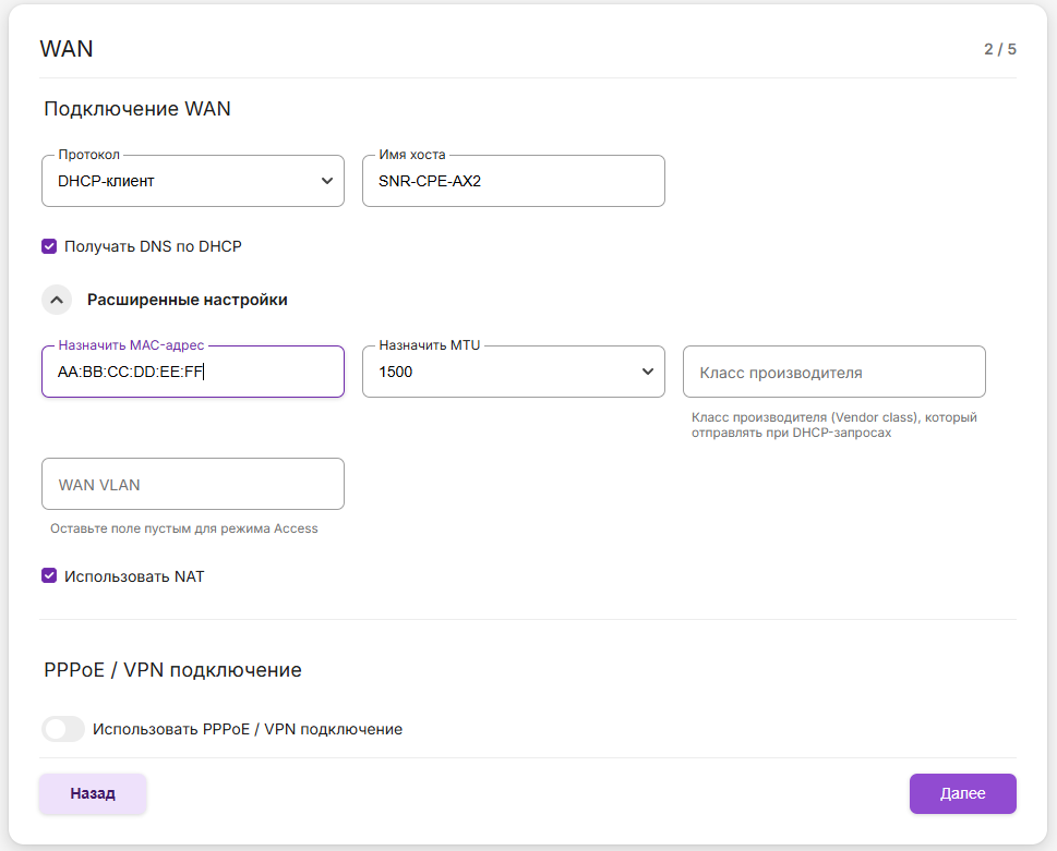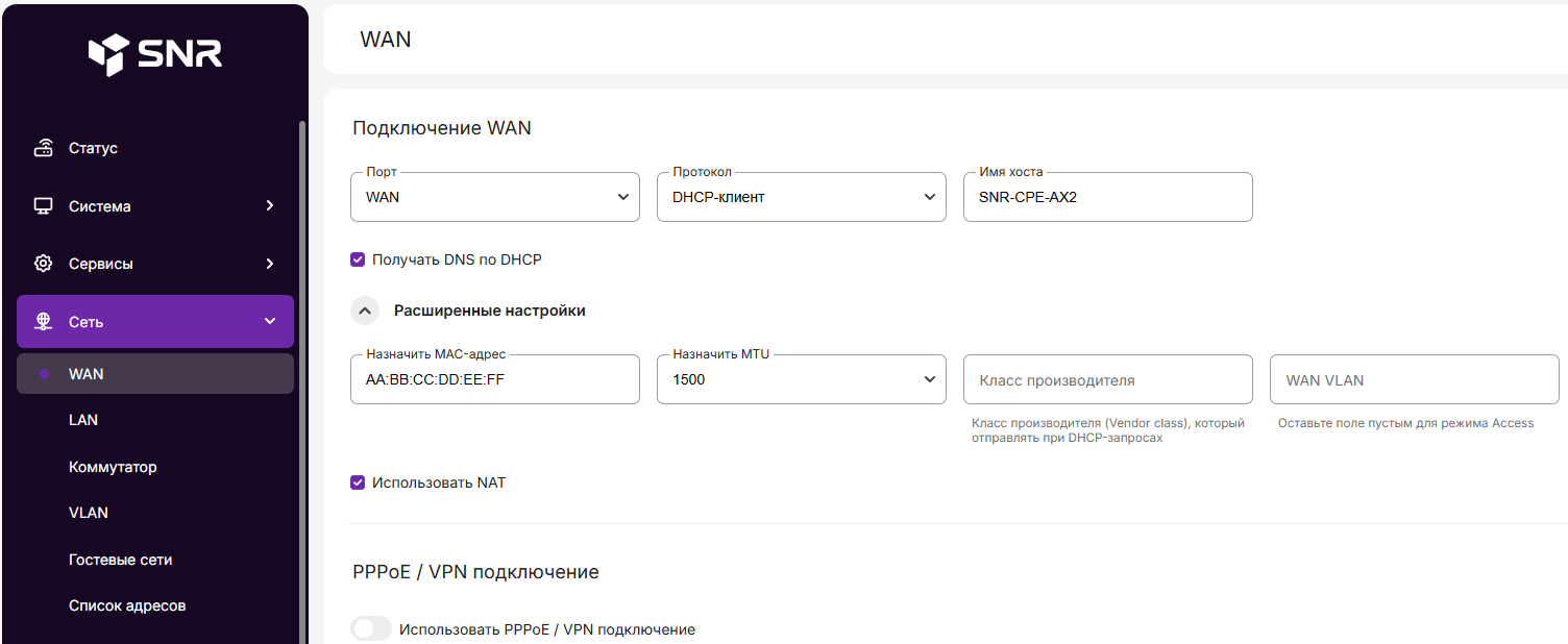 -Переходим в «Сеть» → «WAN». В «WAN» нажимаем «Расширенные настройки». Далее в поле «Назначить MAC-адрес» указываем MAC , который хотим задать для роутера.