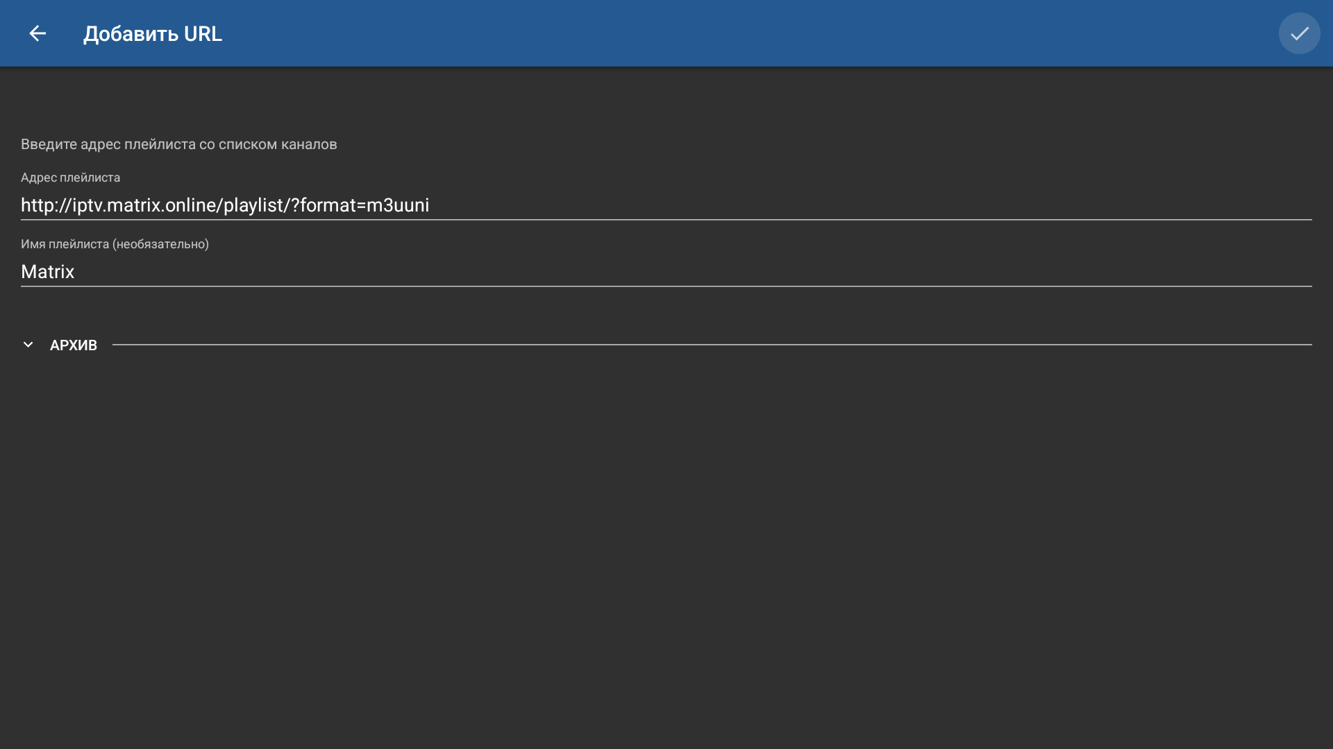 Имя плейлиста(необязательно) - Matrix и нажмите на галочку сверху справа или ОК по середине.