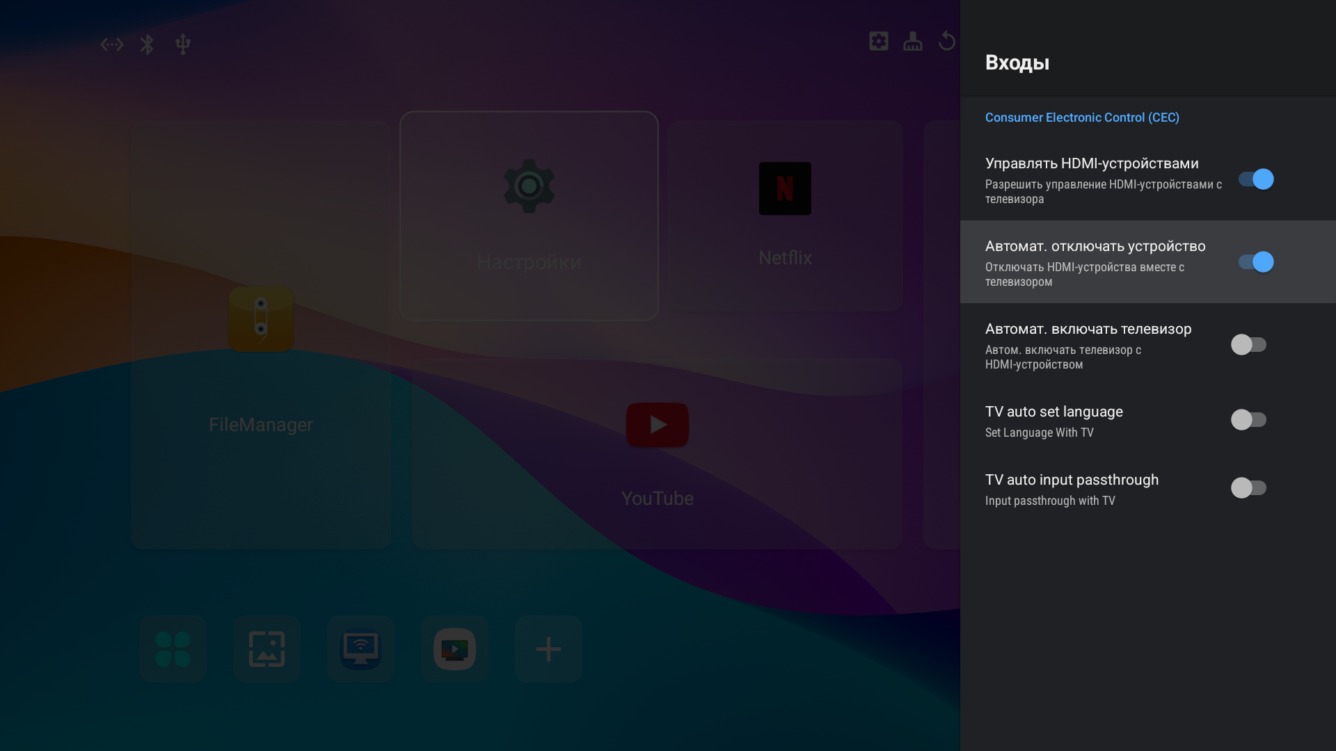 Здесь рассмотрим опцию Управлять HDMI-устройствами. Это позволит включать и выключать приставку автоматически при включении или выключении телевизора. Таким образом, и телевизор и приставка будет выключаться всего одним нажатием кнопки пульта, а также повысит энергосбережение.