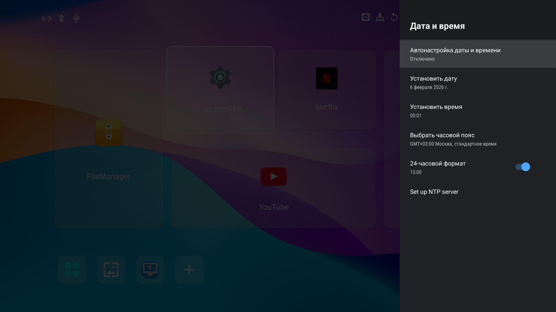 В меню настроек перейдите в раздел Дата и время. Выберите Часовой пояс: Москва, стандартное время, GMT+03:00.